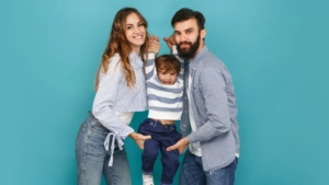 Happy Family of three in a blue background